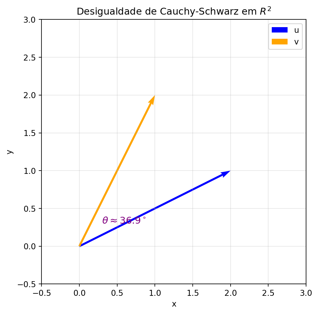 Para vetores em \(\mathbb{R}^2\), o produto interno é o produto escalar usual \(\mathbf{u} \cdot \mathbf{v} = u_1 v_1 + u_2 v_2\). A desigualdade garante que o quadrado do produto escalar nunca é maior que o produto dos quadrados das normas: \[ (u_1 v_1 + u_2 v_2)^2 \leq (u_1^2 + u_2^2)(v_1^2 + v_2^2). \] Geometricamente, isso significa que o cosseno do ângulo entre os vetores sempre está entre -1 e 1: \[ \cos \theta = \frac{\mathbf{u}\cdot \mathbf{v}}{|\mathbf{u}||\mathbf{v}|}. \]