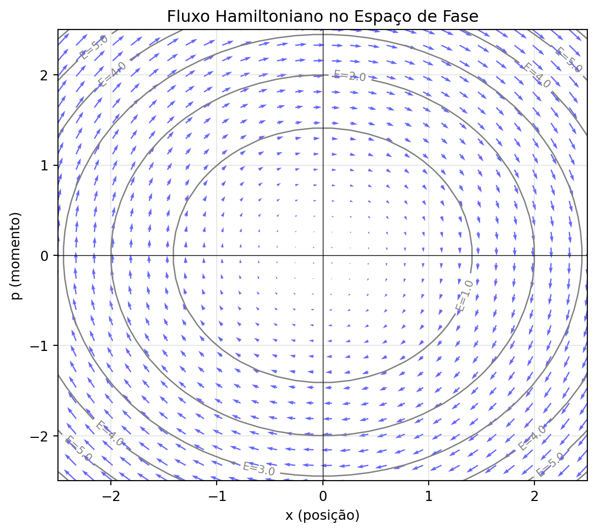 Ou seja, a mesma operação \(\mathbf{v}_1^T J \mathbf{v}_2\) que mede área entre vetores também mede a “independência” entre funções no espaço de fase. Essa estrutura é o coração da mecânica Hamiltoniana, e mais adiante veremos como ela se conecta às relações de comutação na mecânica quântica.