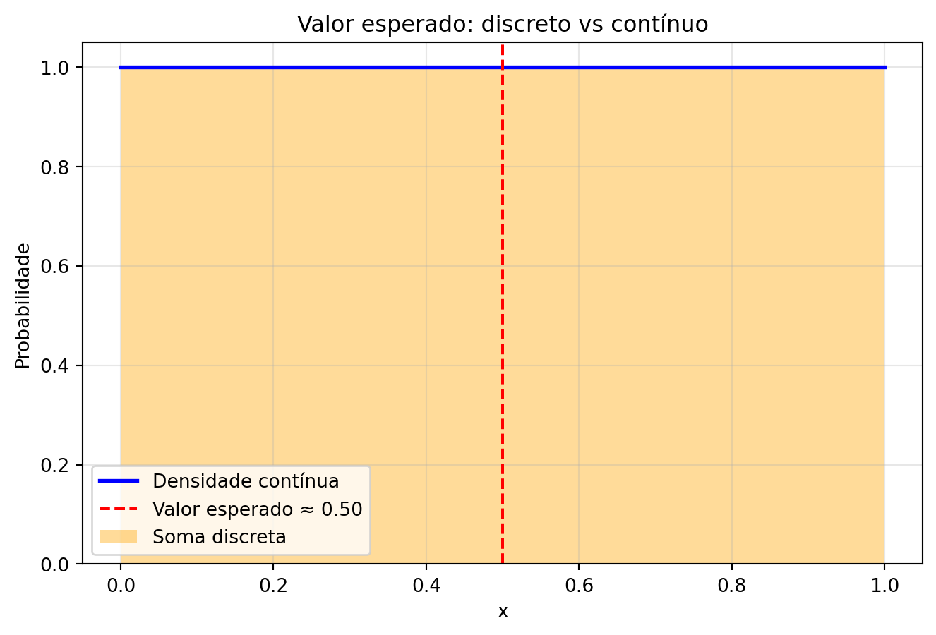 Para uma distribuição uniforme, \(P(x) = 1/(b-a)\). O valor esperado é \[ \mu = \langle x \rangle = \int_a^b x P(x)\mathrm{d}x = \frac{1}{b-a} \int_a^b x\mathrm{d}= \frac{a+b}{2}. \]