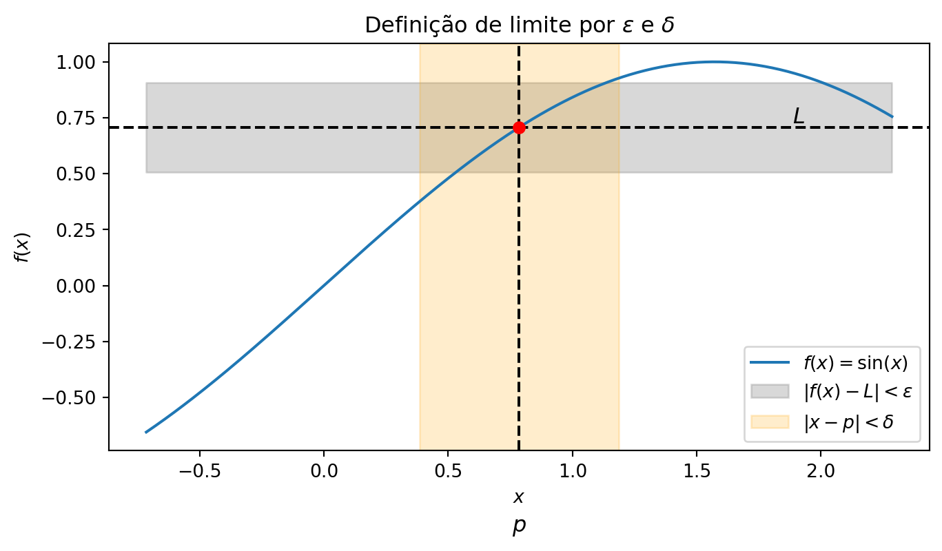 - Por que a escolha de \(\delta = \min(|x_1 - p|, |x_2 - p|)\) garante que todos os valores de \(x\) dentro de \((p-\delta, p+\delta)\) levam \(f(x)\) para dentro da faixa \(|f(x)-L|<\varepsilon\)?