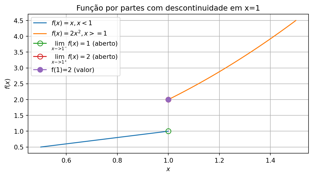 - Explique como a descontinuidade em \(x=1\) impede a existência do limite \(\lim_{x \to 1} f(x)\).
