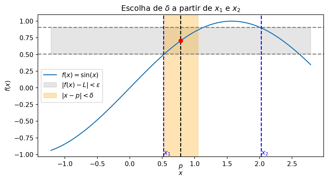 Com essa escolha, o intervalo \((p-\delta,\, p+\delta)\) fica inteiramente contido em \((x_1,\,x_2)\), o que garante: \[ 0<|x-p|<\delta \quad \Rightarrow \quad |f(x)-L|<\varepsilon. \]